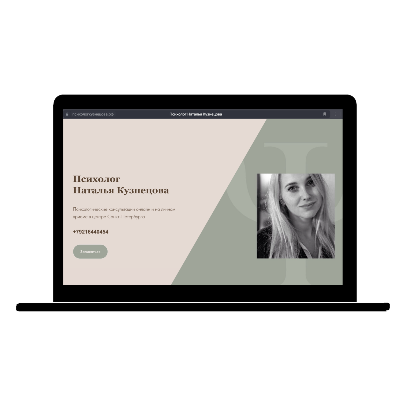 В данном проекте важно было отразить личность специалиста, показать его человеческую сторону. Цвета для сайта были подобраны с учетом вида деятельности - спокойные и располагающие.